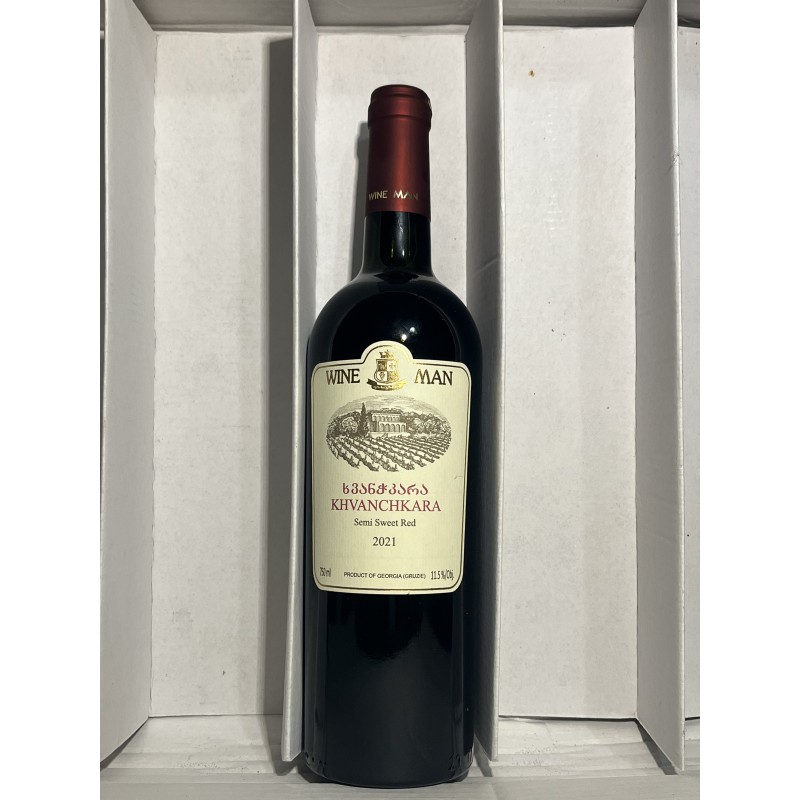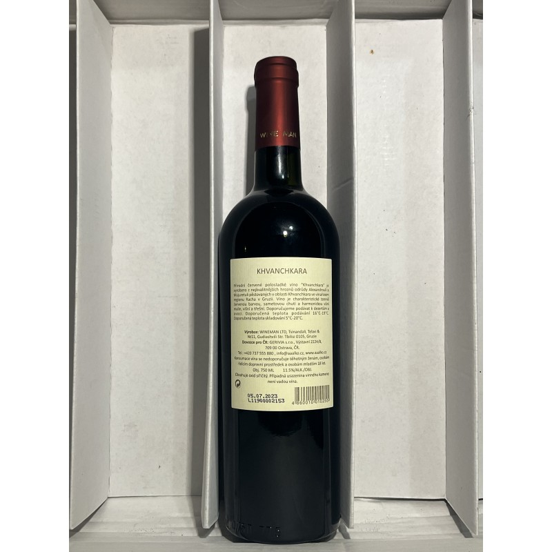 Přírodní červené polosladké víno "Khvanchkara" je vyrobeno z nejkvalitnějších hroznů odrůdy Alexandrouli a Mujuretuli pěstovaných v oblasti Khvanchkara ve vinařském regionu Racha v Gruzii. Víno je charakteristické temně červenou barvou, sametovou chutí a harmonickou vůní malin, višní a třešní. Doporučujeme prodávat k dezertům a ovoci.