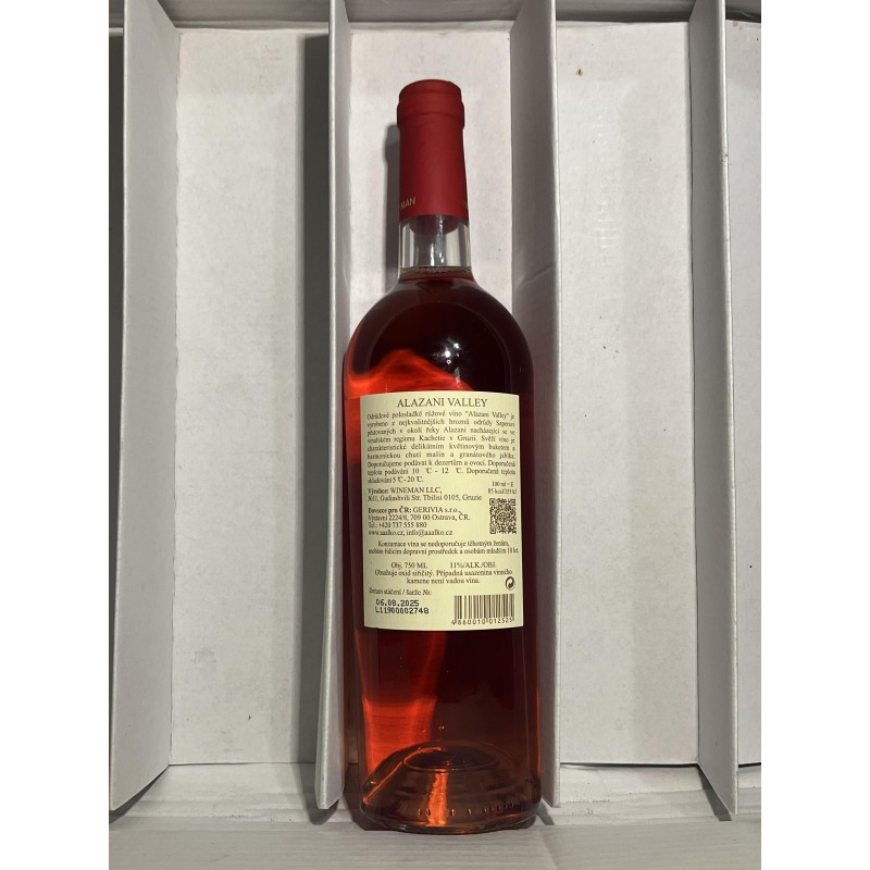 Odrůdové polosladké růžové víno "Alazani Valley" je vyrobeno z nejkvalitnějších hroznů odrůdy Saperavi pěstovaných v okolí řeky Alazani nacházející se ve vinařském regionu Kachetie v Gruzii. Svěží víno je charakteristické delikátním květinovým buketem a harmonickou chutí malin a granátového jablka.